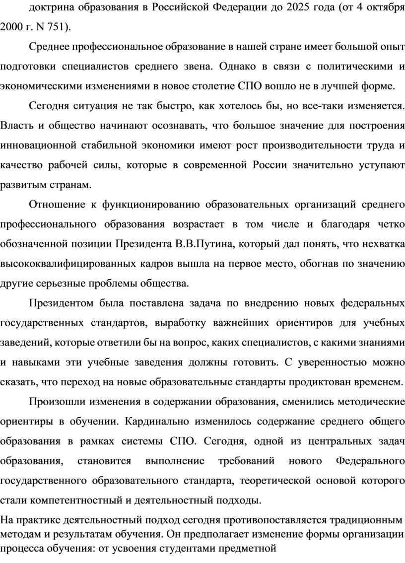 Таким образом, в качестве определяющего направления деятельности системы образования страны в настоящее время выдвигается идея превращения российского образования в важнейший фактор обеспечения растущей конкурентоспособности России в условиях цивилизационных вызовов XXI века, что находит отражение в таких официальных документах, как Национальная доктрина образования в Российской Федерации до 2025 года (от 4 октября 2000 г. N 751).