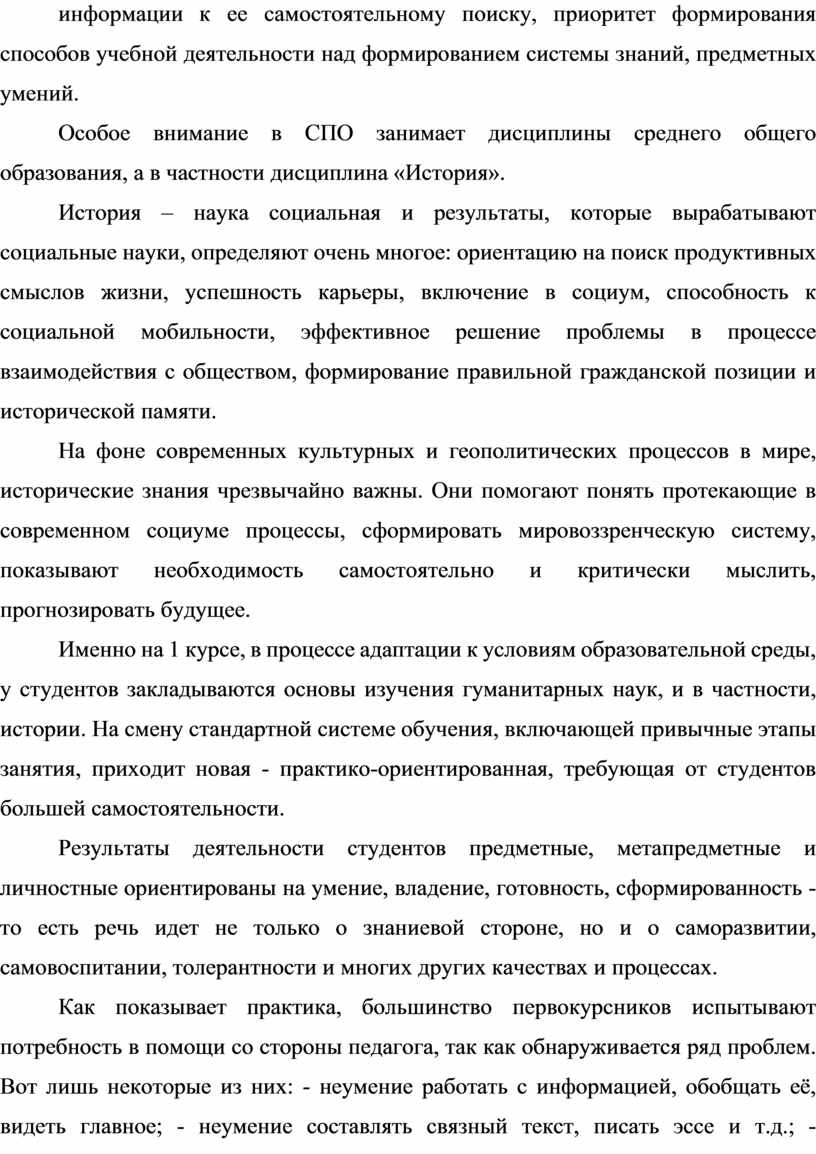 Именно на 1 курсе, в процессе адаптации к условиям образовательной среды, у студентов закладываются основы изучения гуманитарных наук, и в частности, истории. На смену стандартной системе обучения, включающей привычные этапы занятия, приходит новая - практико-ориентированная, требующая от студентов большей самостоятельности.
