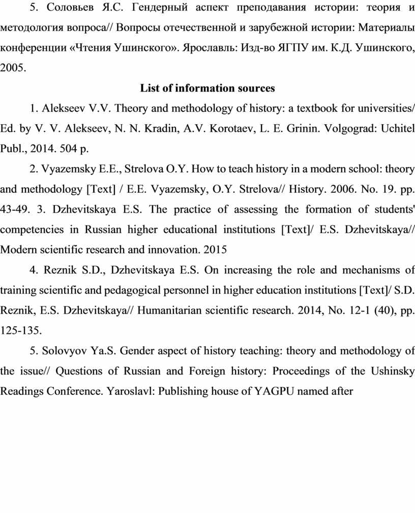 5. Solovyov Ya.S. Gender aspect of history teaching: theory and methodology of the issue// Questions of Russian and Foreign history: Proceedings of the Ushinsky Readings Conference. Yaroslavl: Publishing house of YAGPU named after