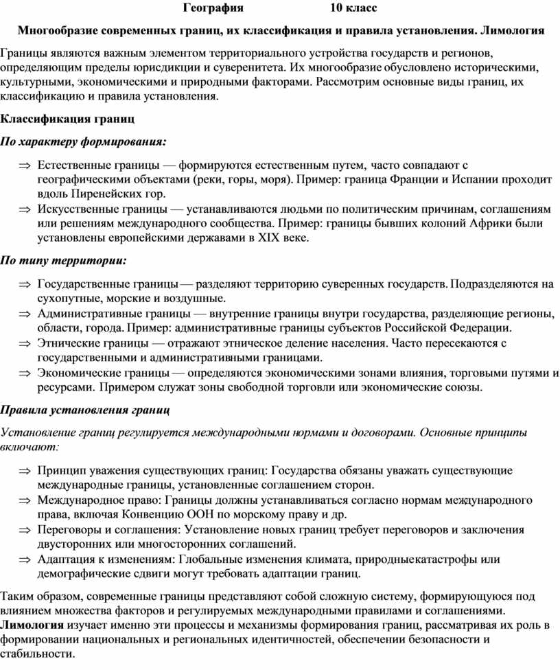 Таким образом, современные границы представляют собой сложную систему, формирующуюся под влиянием множества факторов и регулируемых международными правилами и соглашениями. Лимология изучает именно эти процессы и механизмы формирования границ, рассматривая их роль в формировании национальных и региональных идентичностей, обеспечении безопасности и стабильности.