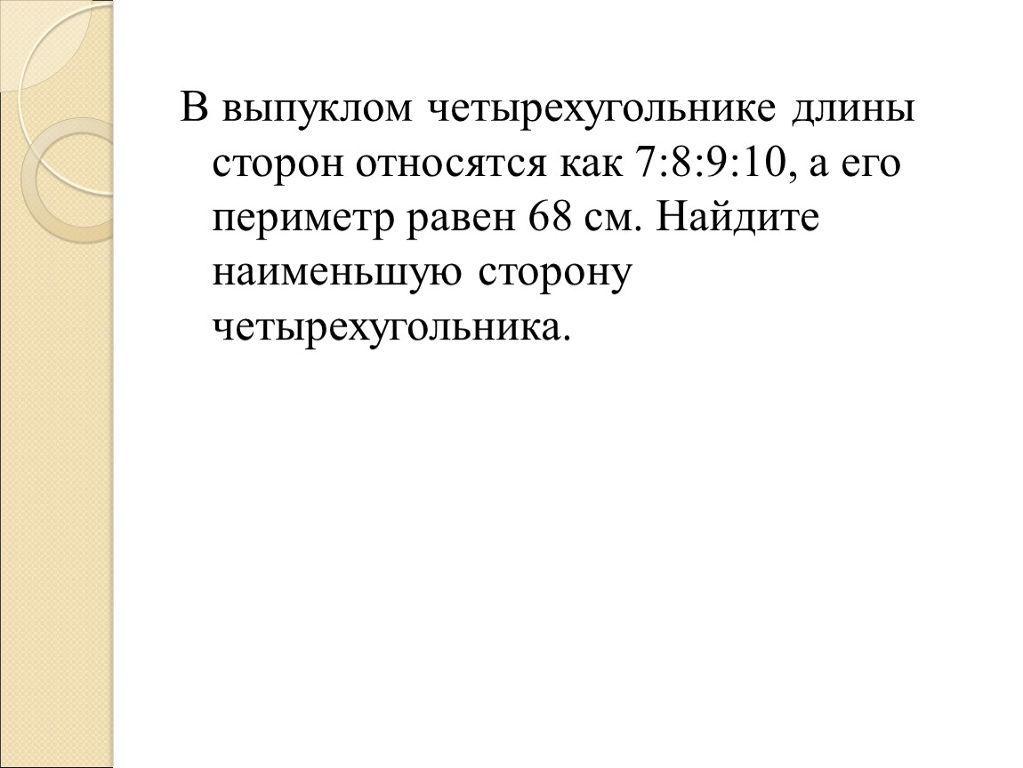 В выпуклом четырехугольнике длины сторон относятся как 7:8:9:10, а его периметр равен 68 см. Найдите наименьшую сторону четырехугольника.