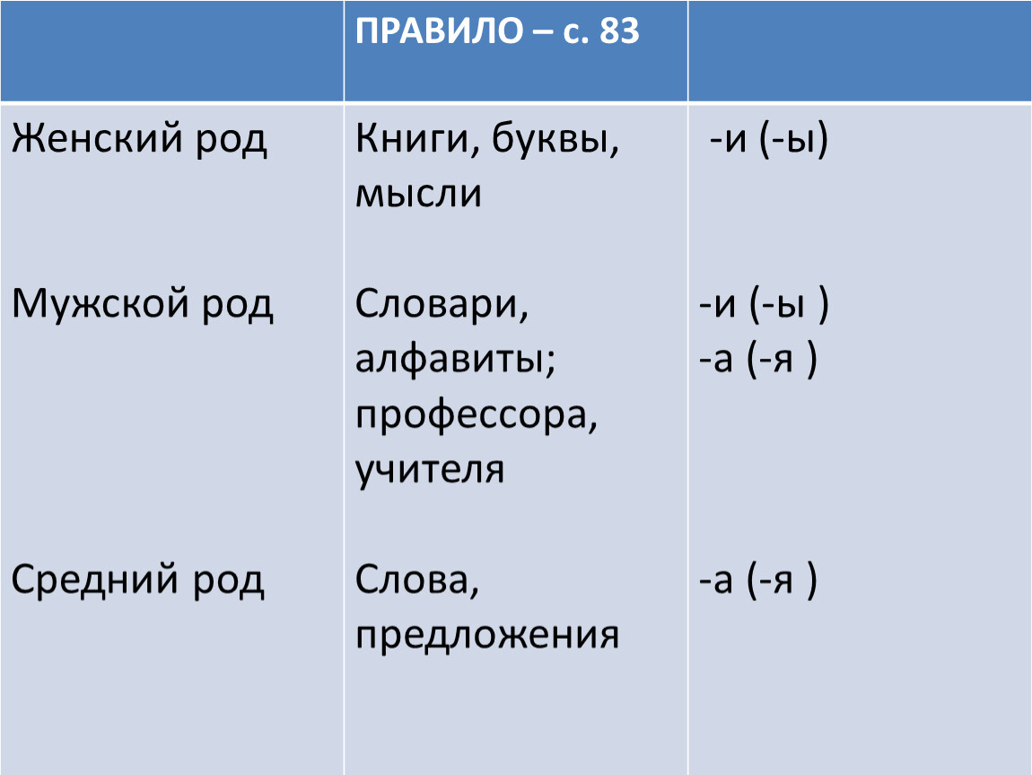 Женский род | Книги, буквы, мысли | -и (-ы) |