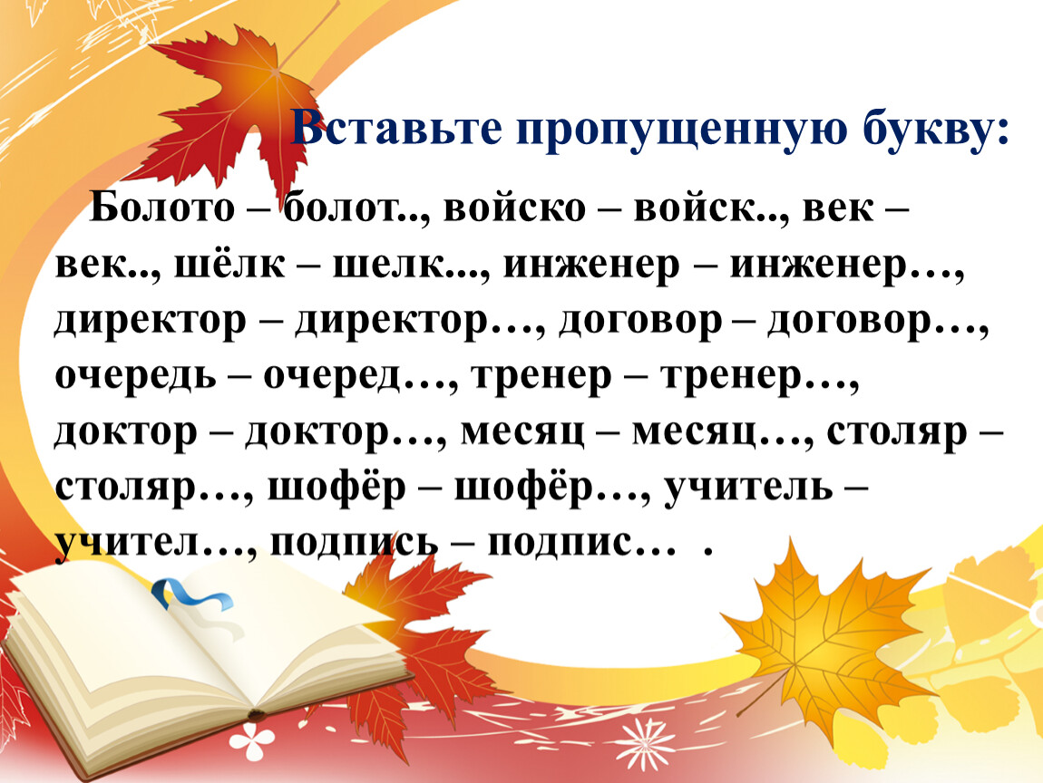 Болото – болот.., войско – войск.., век – век.., шёлк – шелк..., инженер – инженер…, директор – директор…, договор – договор…, очередь – очеред…, тренер – тренер…,