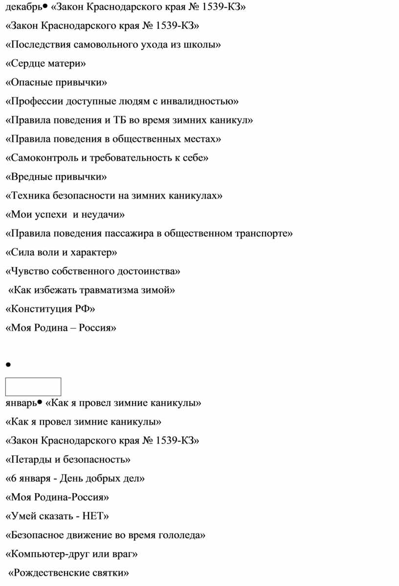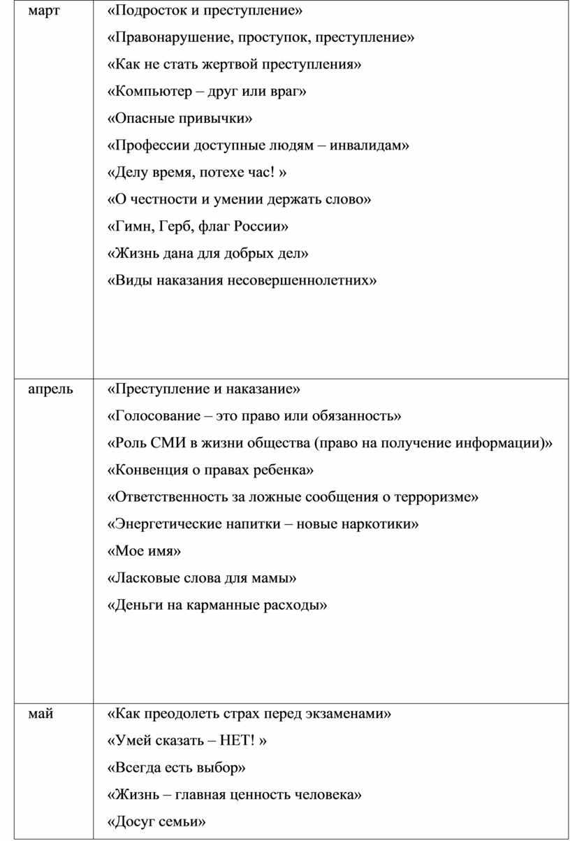 · вопросам государства и права (эти классные часы развивают интерес школьников к политическим событиям, происходящим в мире; формируют чувство ответственности и гордости за Родину, ее успехи на международной арене; учат видеть суть государственной политики. Классные часы на политические темы должны проводиться в прямой зависимости от насыщенности года различными политическими событиями).