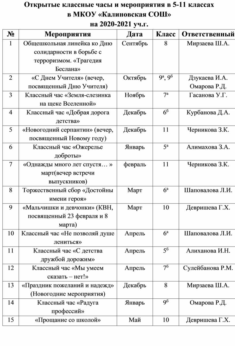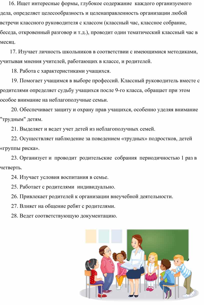 16. Ищет интересные формы, глубокое содержание каждого организуемого дела, определяет целесообразность и целенаправленность организации любой встречи классного руководителя с классом (классный час, классное собрание, беседа, откровенный разговор и т. д.), проводит один тематический классный час в месяц.