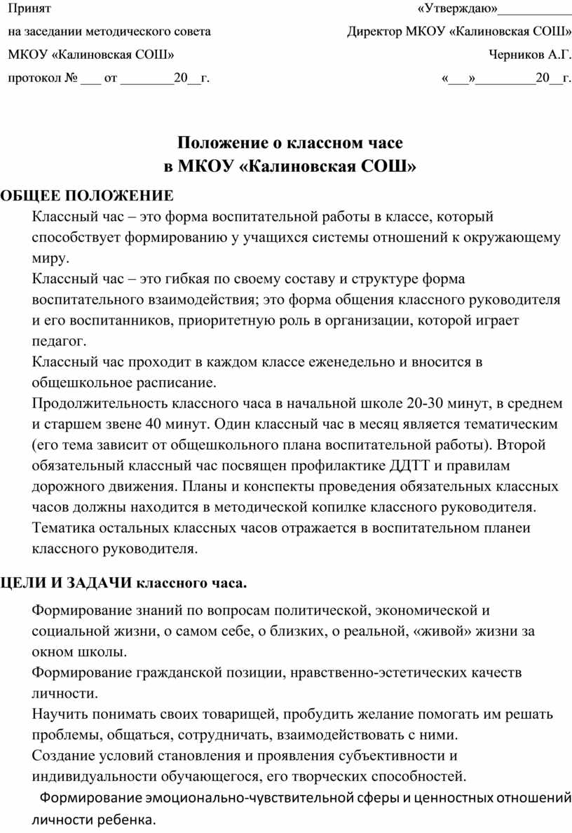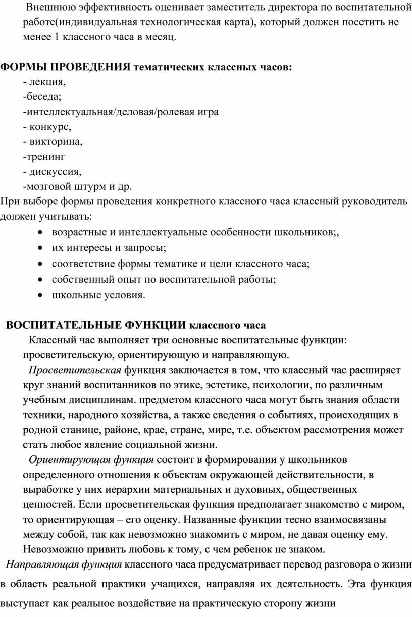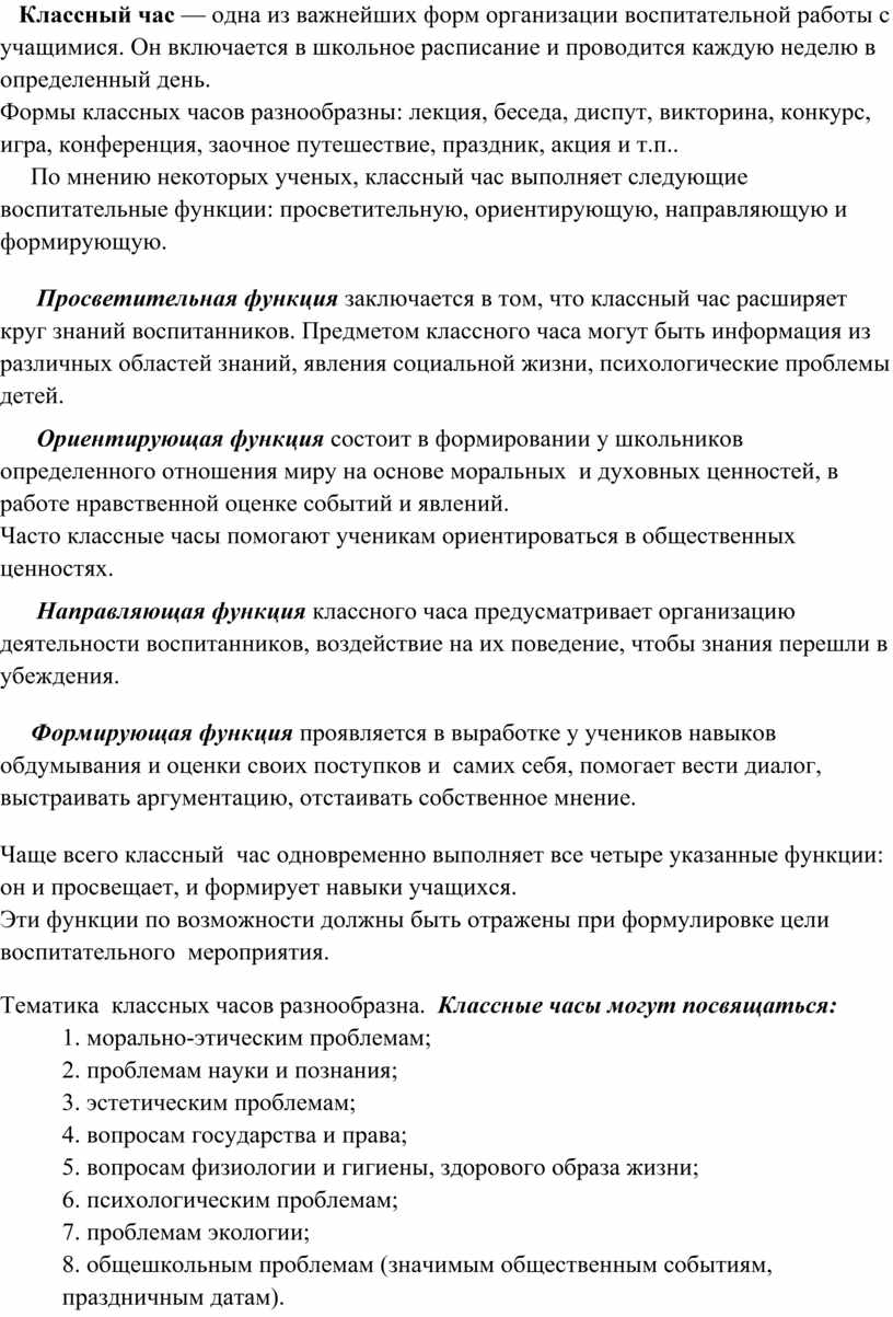 Место классного часа в воспитательной системе ________________________________