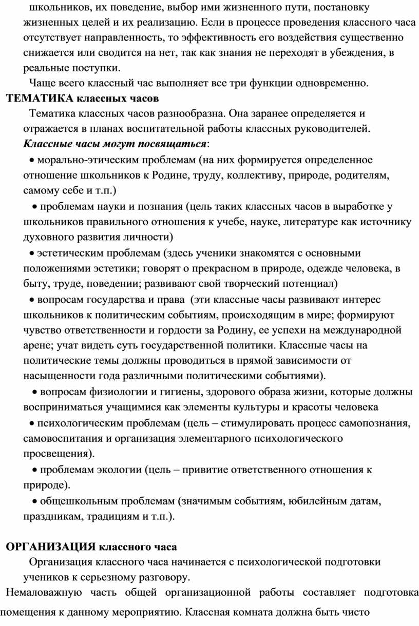 Тематика классных часов разнообразна. Она заранее определяется и отражается в планах воспитательной работы классных руководителей. Классные часы могут посвящаться: