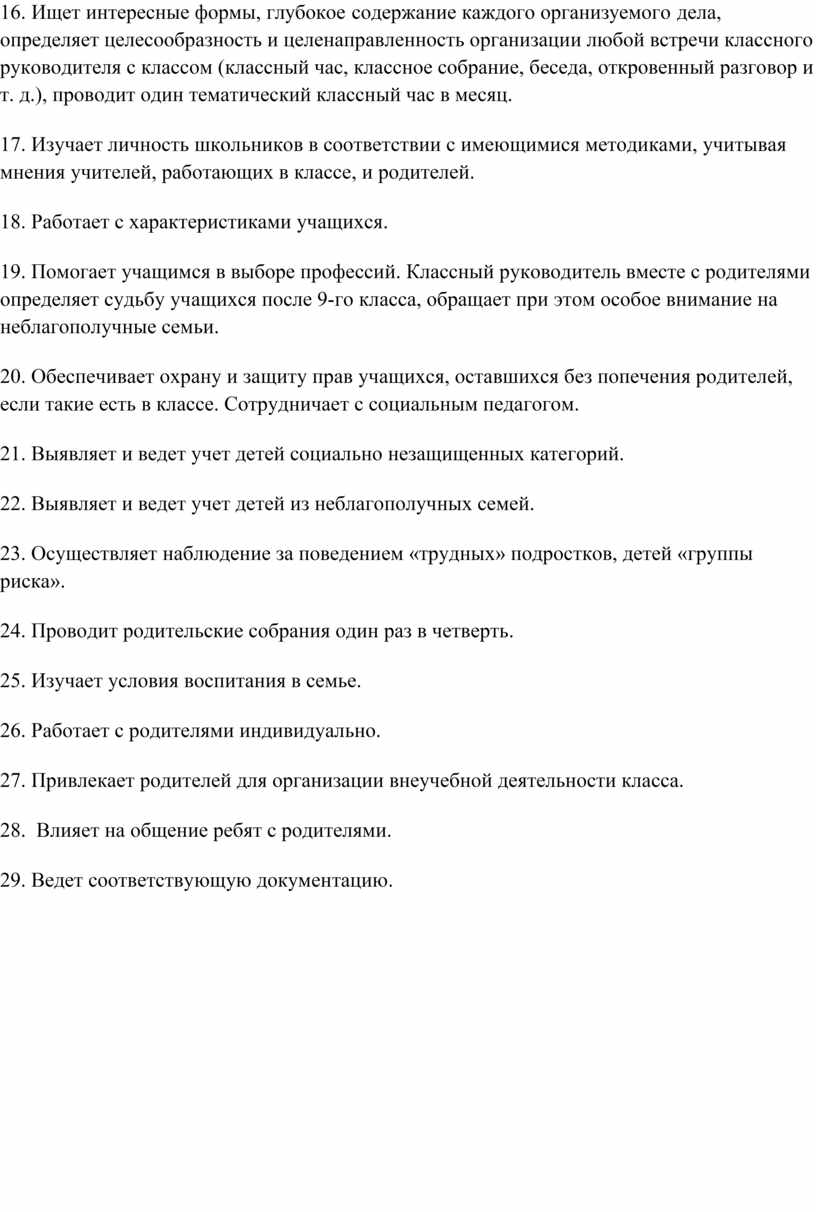20. Обеспечивает охрану и защиту прав учащихся, оставшихся без попечения родителей, если такие есть в классе. Сотрудничает с социальным педагогом.