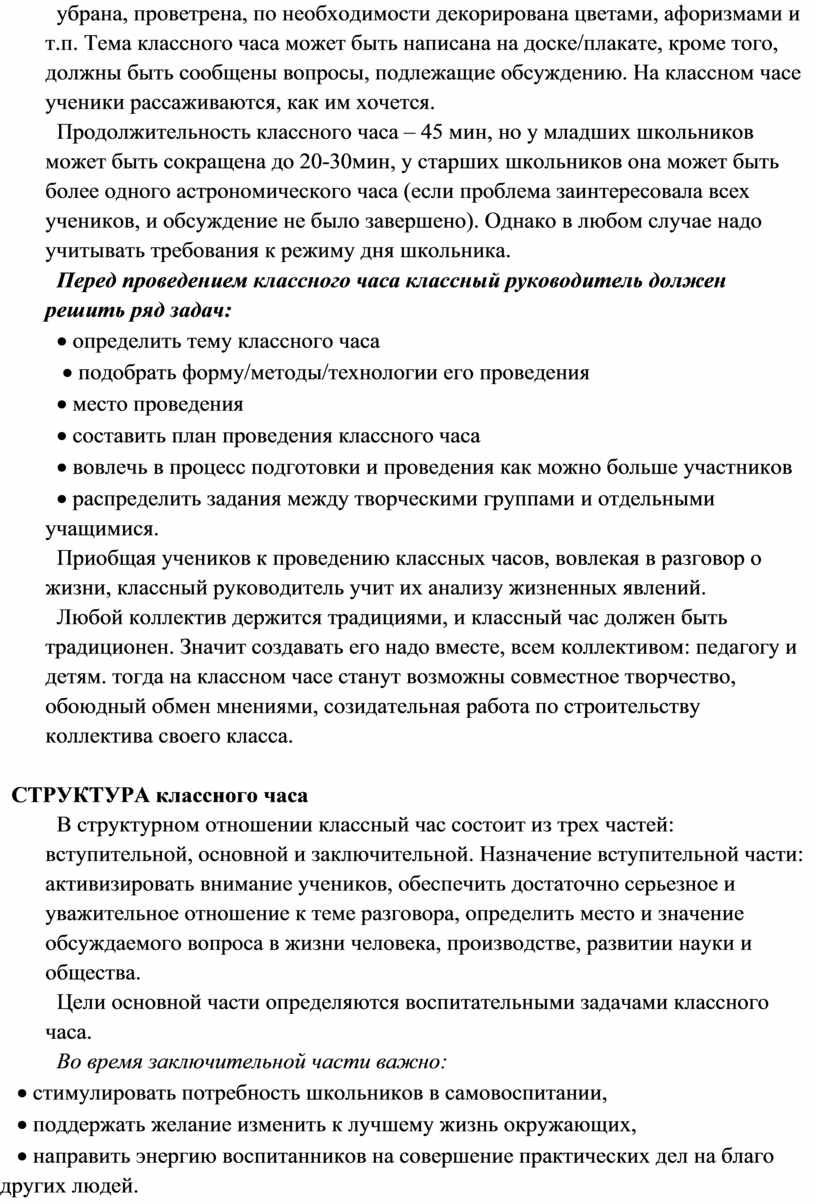 В структурном отношении классный час состоит из трех частей: вступительной, основной и заключительной. Назначение вступительной части: активизировать внимание учеников, обеспечить достаточно серьезное и уважительное отношение к теме разговора, определить место и значение обсуждаемого вопроса в жизни человека, производстве, развитии науки и общества.