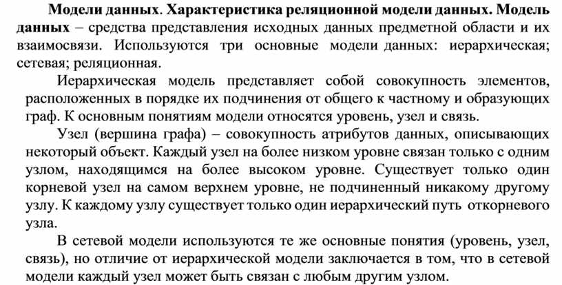 Иерархическая модель представляет собой совокупность элементов, расположенных в порядке их подчинения от общего к частному и образующих граф. К основным понятиям модели относятся уровень, узел и связь.