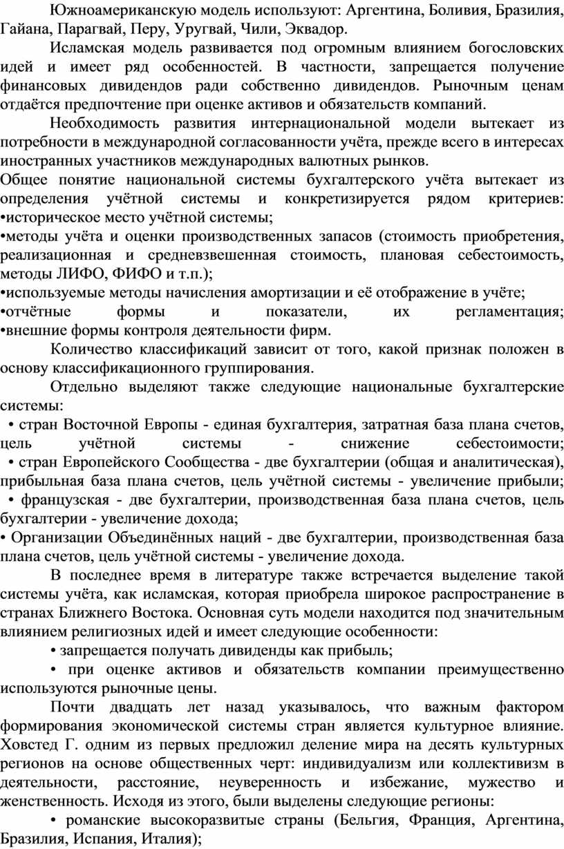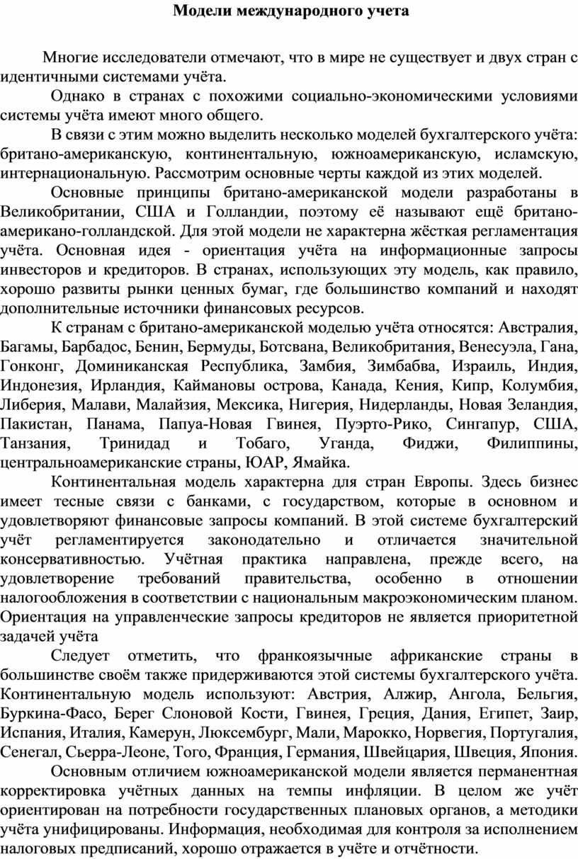 В связи с этим можно выделить несколько моделей бухгалтерского учёта: британо-американскую, континентальную, южноамериканскую, исламскую, интернациональную. Рассмотрим основные черты каждой из этих моделей.