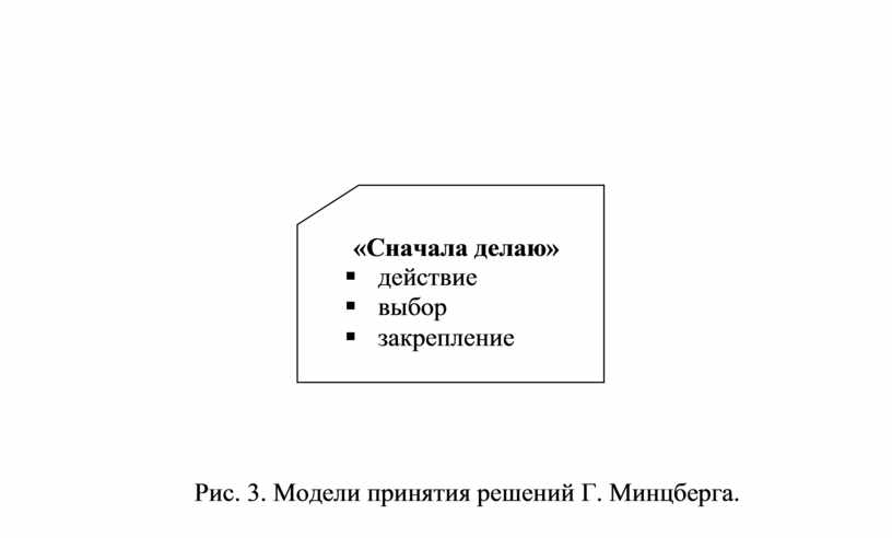 Г. Минцберг утверждает: "Принятие решений - это не то, что Вы об этом думаете". Отличие предложенных им моделей состоит в том, что надо отказаться от излишней формализации, от идеи, что решение всегда предшествует действию, а также локализовано во времени (рис 3).