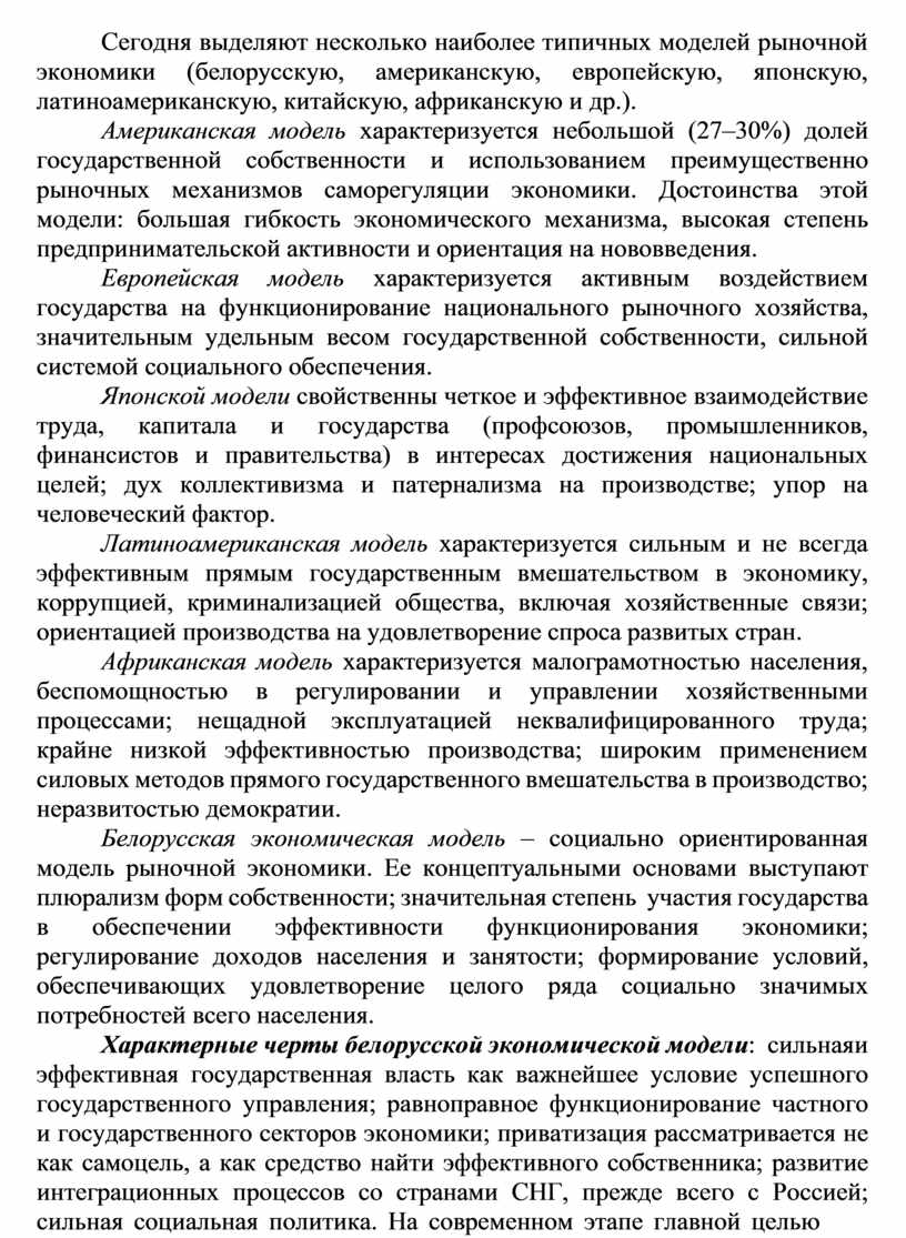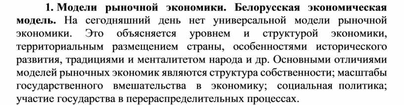 1. Модели рыночной экономики. Белорусская экономическая модель. На сегодняшний день нет универсальной модели рыночной экономики. Это объясняется уровнем и структурой экономики, территориальным размещением страны, особенностями исторического развития, традициями и менталитетом народа и др. Основными отличиями моделей рыночных экономик являются структура собственности; масштабы государственного вмешательства в экономику; социальная политика; участие государства в перераспределительных процессах.