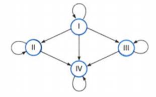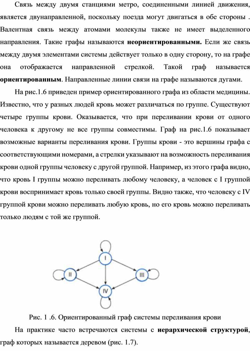 На рис.1.6 приведен пример ориентированного графа из области медицины. Известно, что у разных людей кровь может различаться по группе. Существуют четыре группы крови. Оказывается, что при переливании крови от одного человека к другому не все группы совместимы. Граф на рис.1.6 показывает возможные варианты переливания крови. Группы крови - это вершины графа с соответствующими номерами, а стрелки указывают на возможность переливания крови одной группы человеку с другой группой. Например, из этого графа видно, что кровь I группы можно переливать любому человеку, а человек с I группой крови воспринимает кровь только своей группы. Видно также, что человеку с IV группой крови можно переливать любую кровь, но его кровь можно переливать только людям с той же группой.