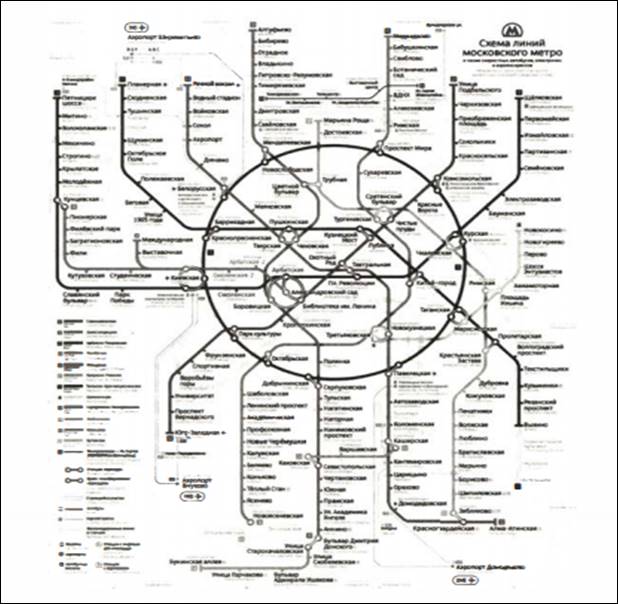Структурную модель системы еще называют структурной схемой. На структурной схеме отражается состав системы и ее внутренние связи. Для отображения структурной схемы системы используются графы. Граф состоит из вершин, обозначающих элементы системы, и ребер - линий, обозначающих связи (отношения) между элементами системы. Знакомая многим схема скоростного транспорта Москвы (рис .1.4) является примером графа. Вершинами здесь являются станции метро, а ребрами - линии движения поездов. Такая схема позволяет пассажиру метро определить маршрут своего перемещения между любыми станциями. Схема метро отражает его радиально-кольцевую структуру.