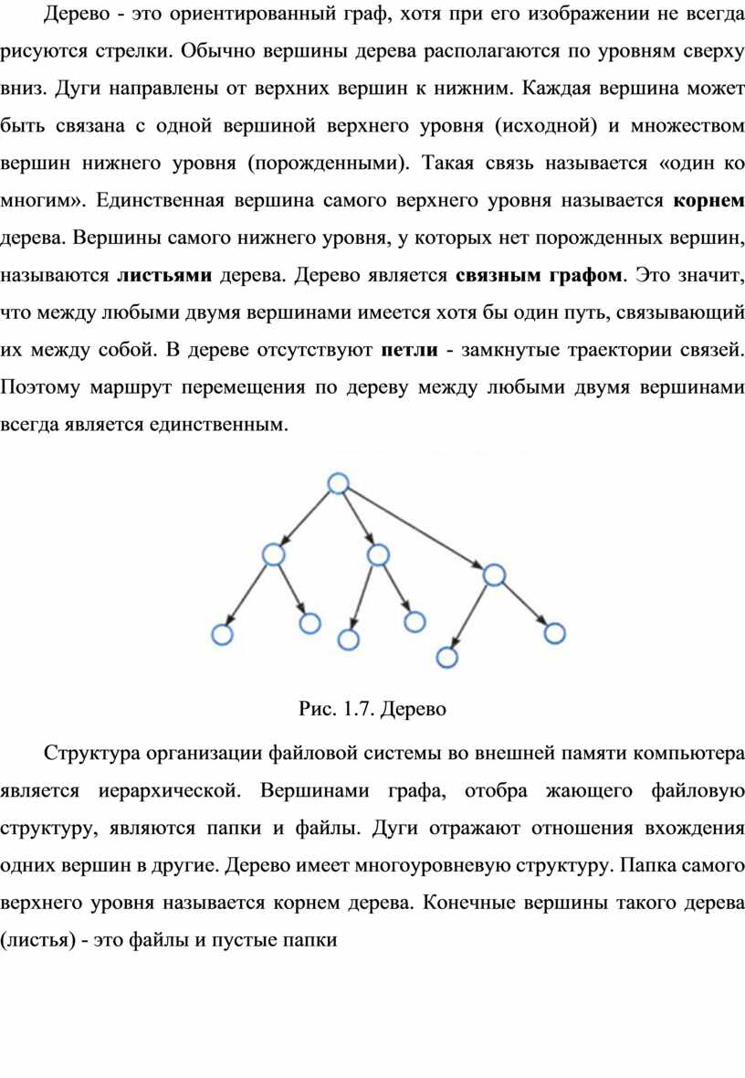 Дерево - это ориентированный граф, хотя при его изображении не всегда рисуются стрелки. Обычно вершины дерева располагаются по уровням сверху вниз. Дуги направлены от верхних вершин к нижним. Каждая вершина может быть связана с одной вершиной верхнего уровня (исходной) и множеством вершин нижнего уровня (порожденными). Такая связь называется «один ко многим». Единственная вершина самого верхнего уровня называется корнем дерева. Вершины самого нижнего уровня, у которых нет порожденных вершин, называются листьями дерева. Дерево является связным графом. Это значит, что между любыми двумя вершинами имеется хотя бы один путь, связывающий их между собой. В дереве отсутствуют петли - замкнутые траектории связей. Поэтому маршрут перемещения по дереву между любыми двумя вершинами всегда является единственным.