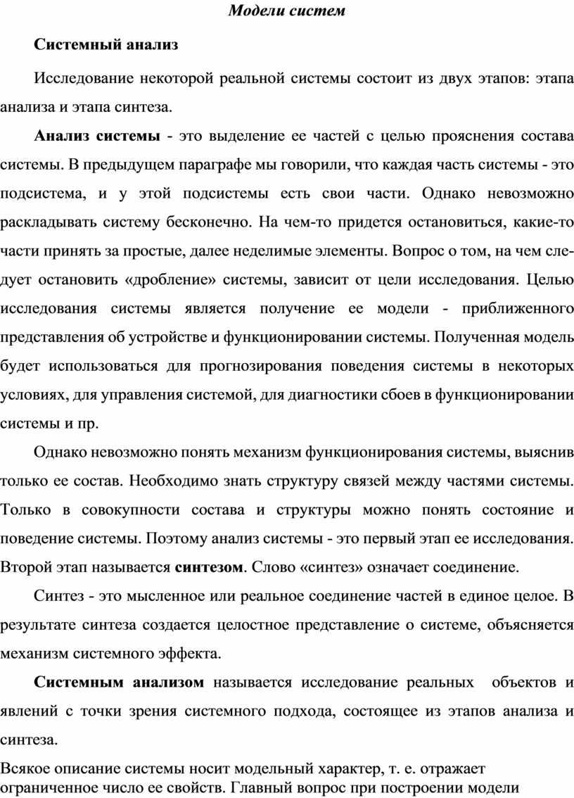 Исследование некоторой реальной системы состоит из двух этапов: этапа анализа и этапа синтеза.