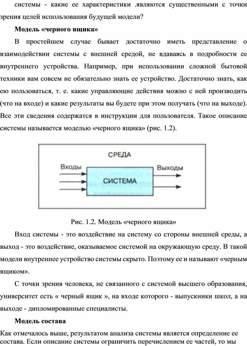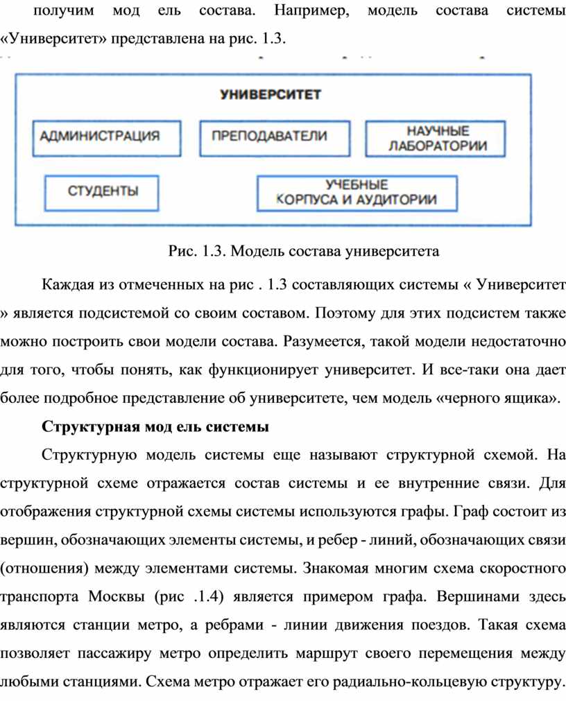 Каждая из отмеченных на рис . 1.3 составляющих системы « Университет » является подсистемой со своим составом. Поэтому для этих подсистем также можно построить свои модели состава. Разумеется, такой модели недостаточно для того, чтобы понять, как функционирует университет. И все-таки она дает более подробное представление об университете, чем модель «черного ящика».