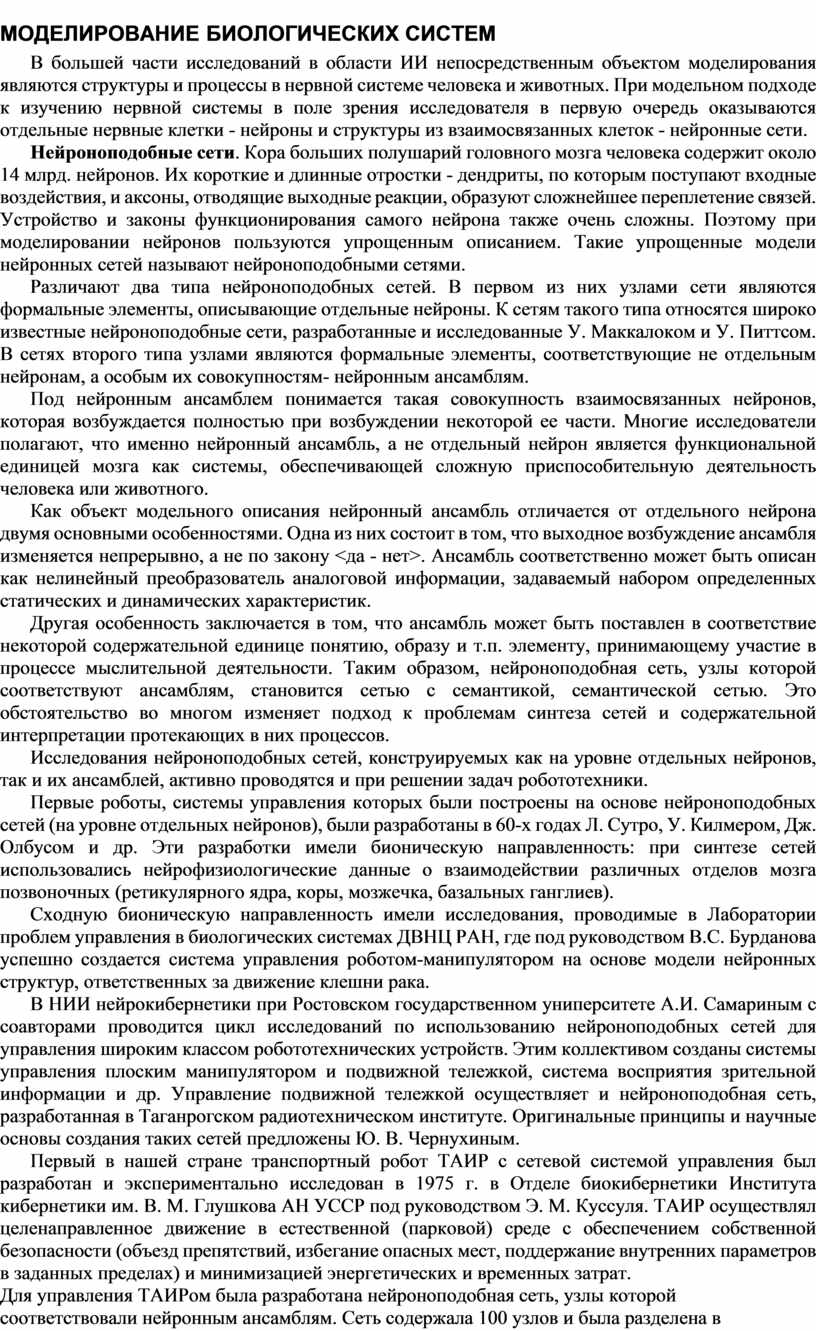 Исследования нейроноподобных сетей, конструируемых как на уровне отдельных нейронов, так и их ансамблей, активно проводятся и при решении задач робототехники.