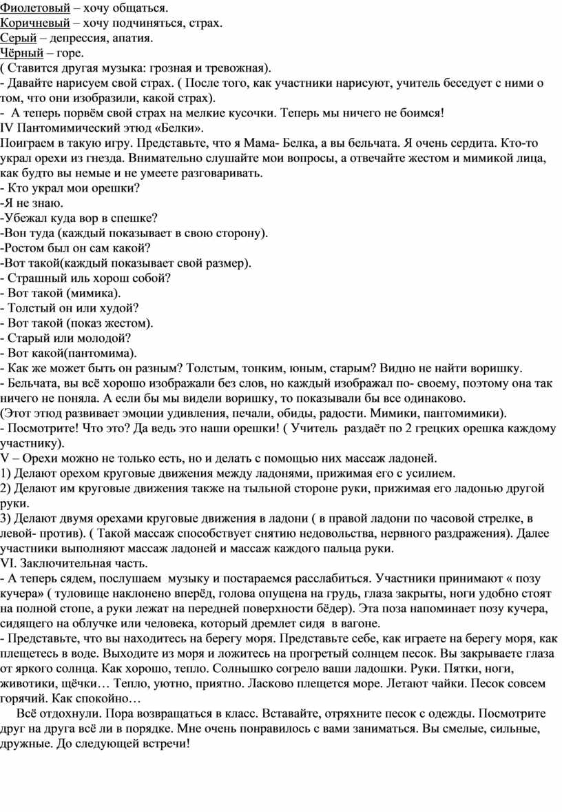 Интересные по содержанию задания, отсутствие напряжённости, создают на занятии положительный эмоциональный фон: раскованность, интерес, осознание своих успехов способствует раскрытию психологических возможностей учащихся. Например с помощью пантомимических этюдов, учащиеся имеют возможность свободно проявлять свои эмоции( удивление, печаль, обида, радость). Также участники тренинга были ознакомлены с элементами китайской терапии «Жуд-ши» ( массаж ладоней грецкими орехами) и методами релаксации, что способствует эмоциональному и физическому отдыху учащихся.