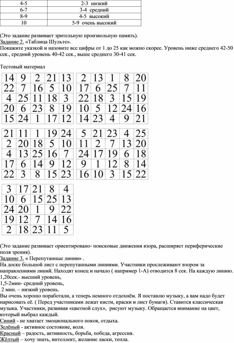Покажите указкой и назовите все цифры от 1 до 25 как можно скорее. Уровень ниже среднего 42-50 сек., средний уровень 40-42 сек., выше среднего 30-41 сек.