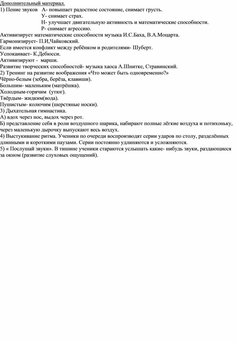 5) « Послушай звуки». В тишине ученики стараются услышать какие- нибудь звуки, раздающиеся за окном (развитие слуховых ощущений).