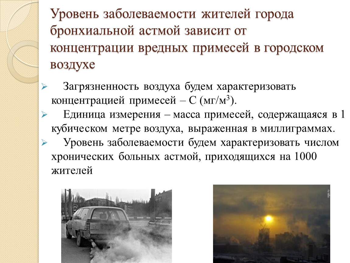 Уровень заболеваемости жителей города бронхиальной астмой зависит от концентрации вредных примесей в городском воздухе