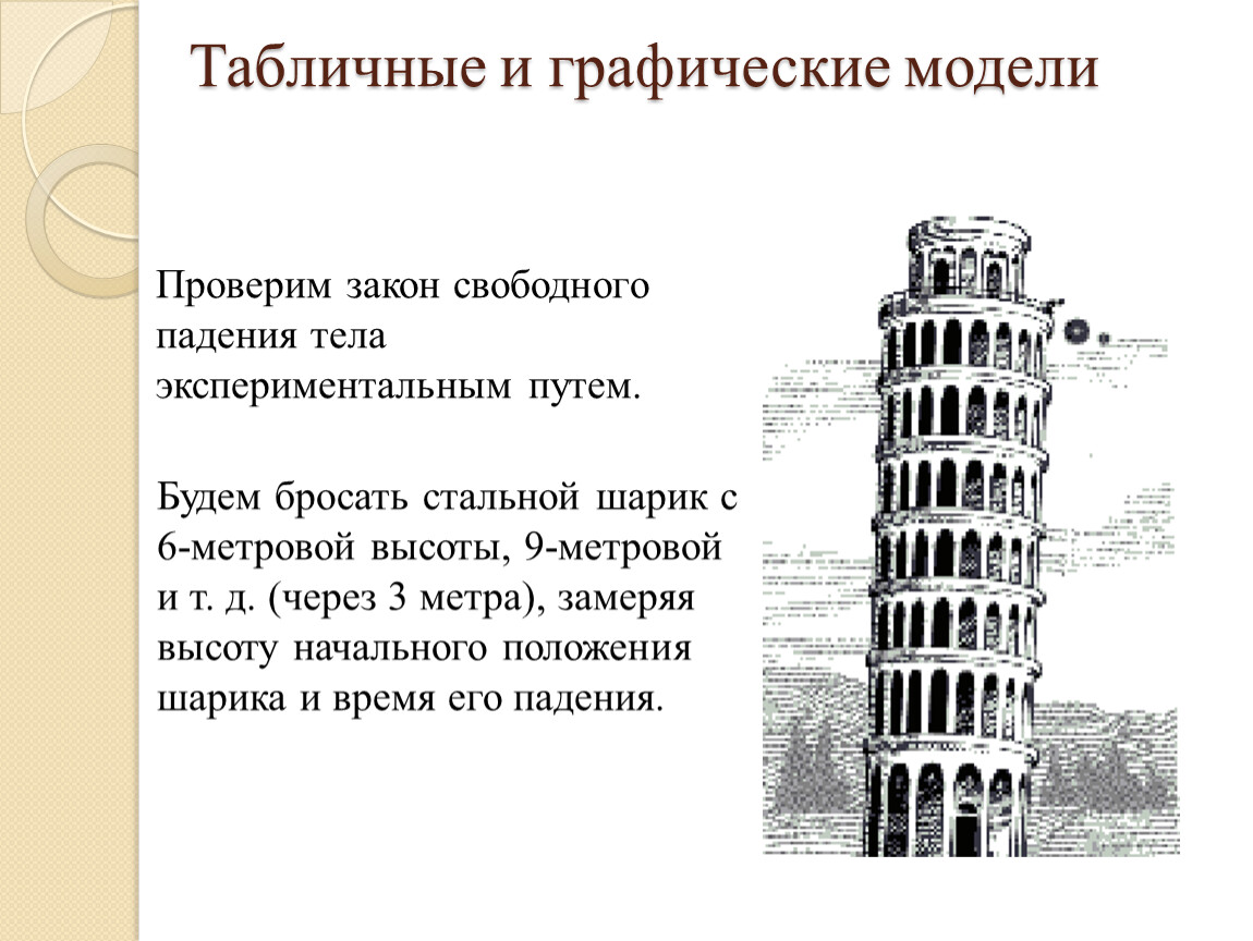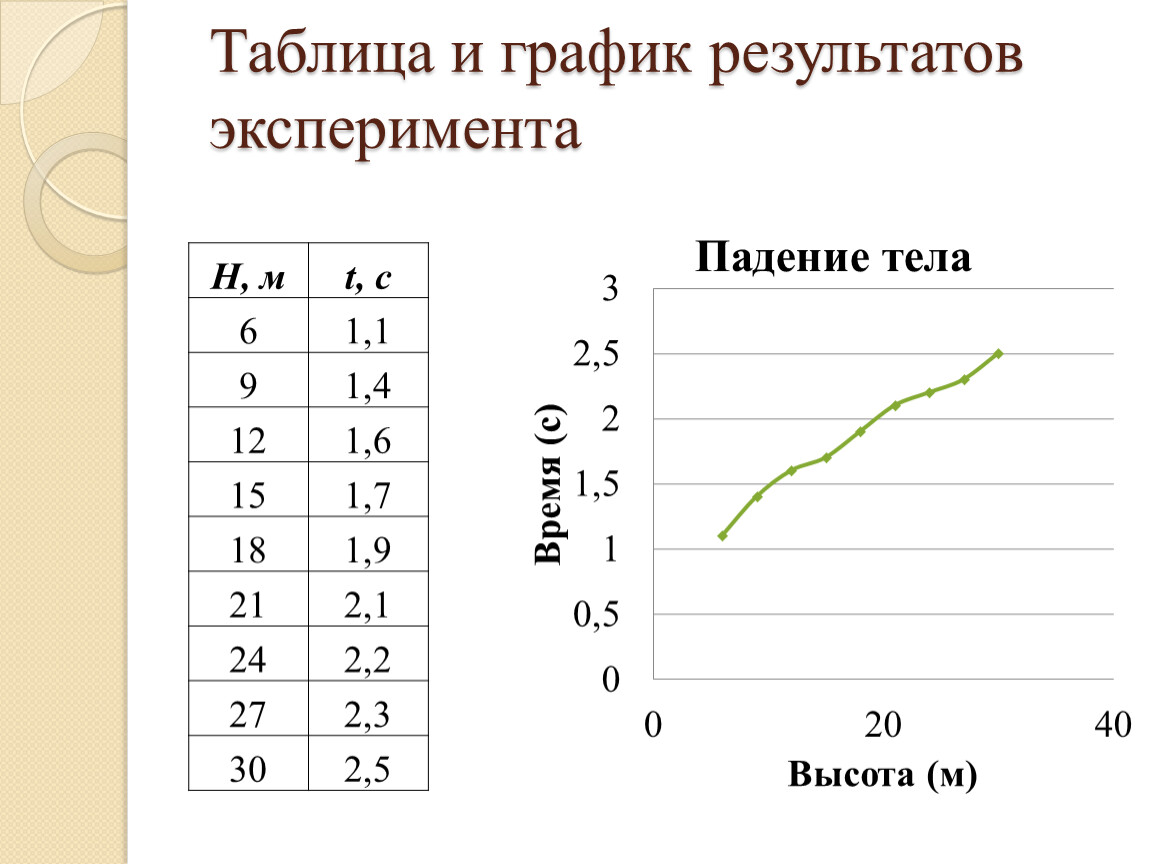 Будем бросать стальной шарик с 6-метровой высоты, 9-метровой и т. д. (через 3 метра), замеряя высоту начального положения шарика и время его падения.
