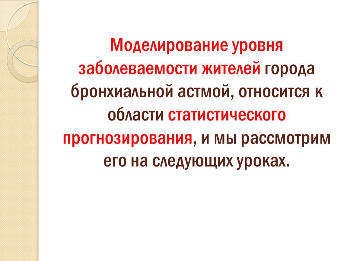 Моделирование уровня заболеваемости жителей города бронхиальной астмой, относится к области статистического прогнозирования, и мы рассмотрим его на следующих уроках.