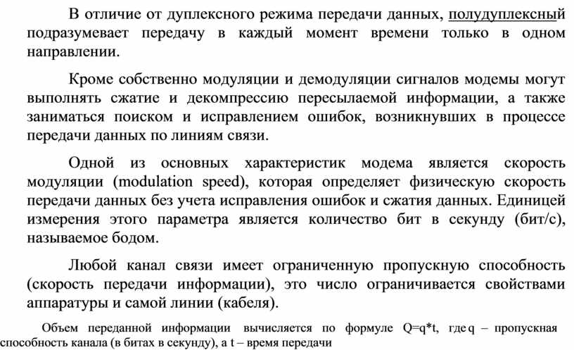 Любой канал связи имеет ограниченную пропускную способность (скорость передачи информации), это число ограничивается свойствами аппаратуры и самой линии (кабеля).