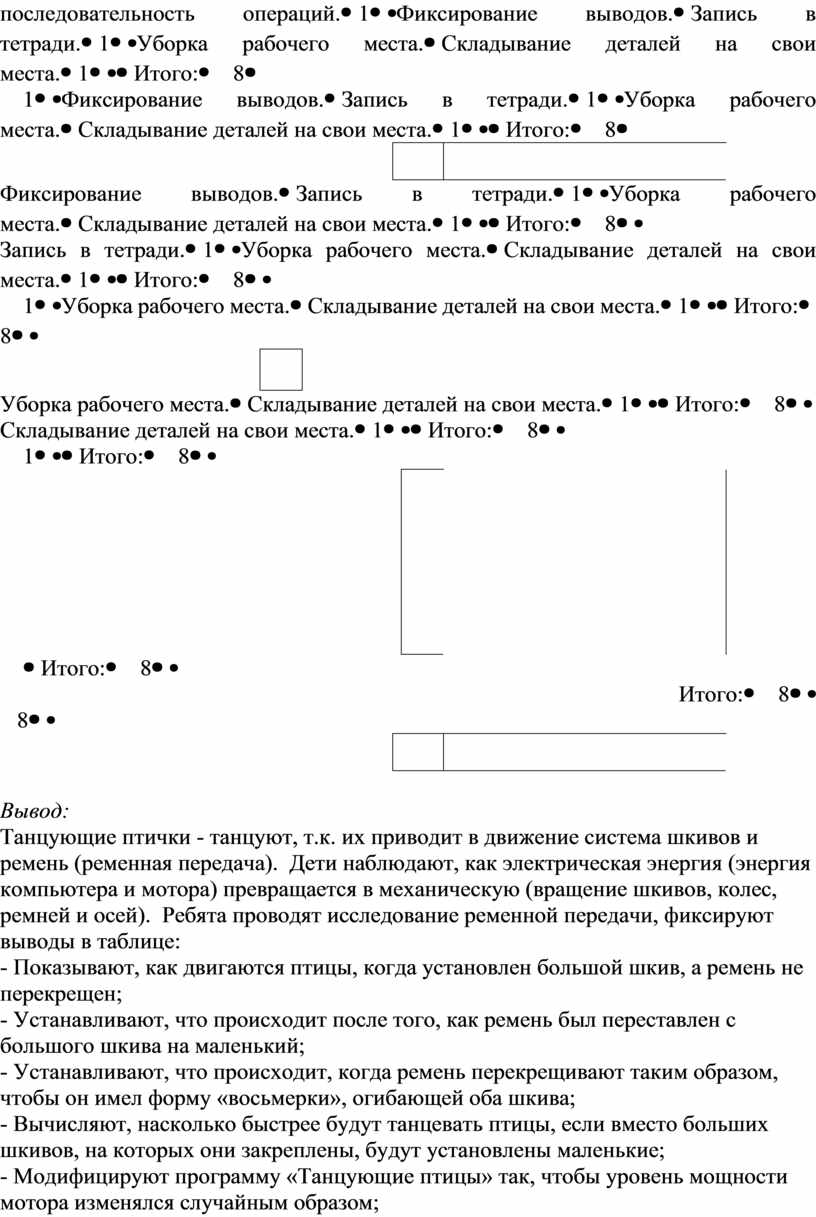 Танцующие птички - танцуют, т.к. их приводит в движение система шкивов и ремень (ременная передача). Дети наблюдают, как электрическая энергия (энергия компьютера и мотора) превращается в механическую (вращение шкивов, колес, ремней и осей). Ребята проводят исследование ременной передачи, фиксируют выводы в таблице: