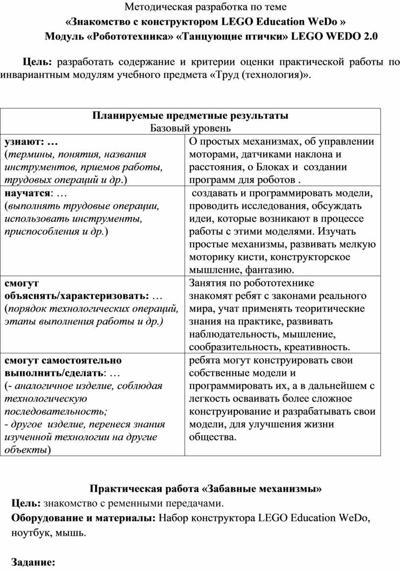 Оборудование и материалы: Набор конструктора LEGO Education WeDo,