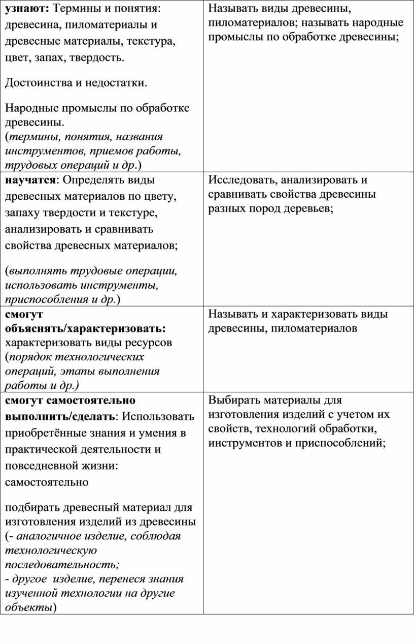 узнают: Термины и понятия: древесина, пиломатериалы и древесные материалы, текстура, цвет, запах, твердость. Достоинства и недостатки. Народные промыслы по обработке древесины. (термины, понятия, названия инструментов, приемов работы, трудовых операций и др.) |