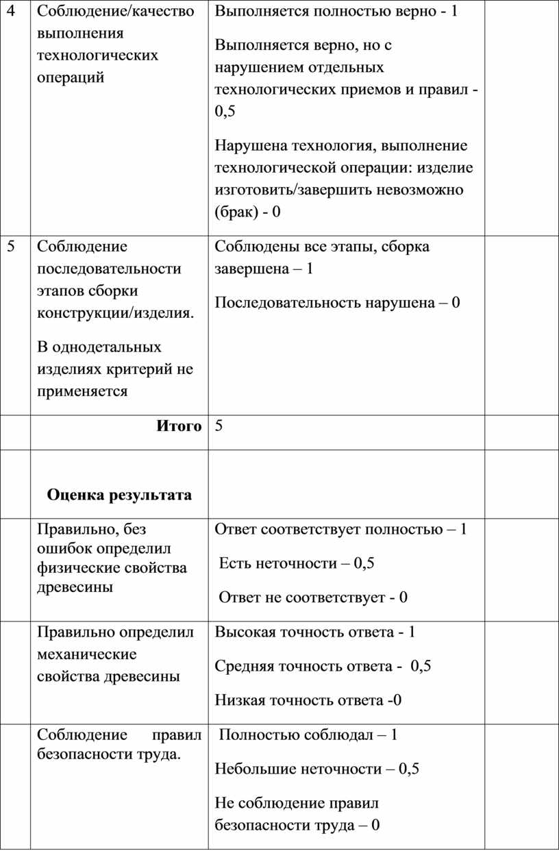 Выполняется полностью верно - 1 Выполняется верно, но с нарушением отдельных технологических приемов и правил - 0,5 Нарушена технология, выполнение технологической операции: изделие изготовить/завершить невозможно (брак) - 0 |