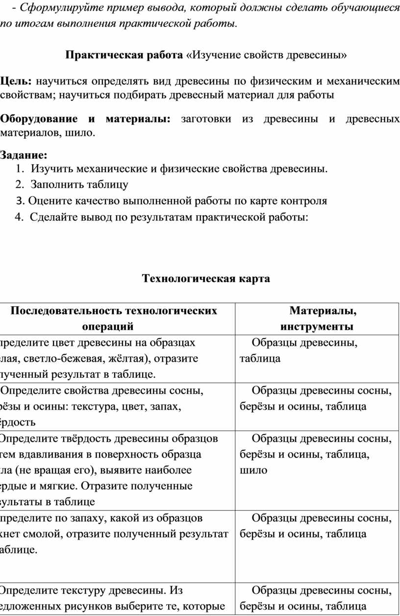 ПРИМЕР ВЫВОДА: В ходе выполнения данной работы учащиеся освоили основные операции по определению механических и физических свойств древесины. Эти навыки помогут в подборе древесных материалов для изготовления изделий из древесины.
