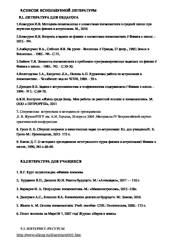1.Кожеуров И.В. Методика ознакомления с элементами космонавтики в средней школе при