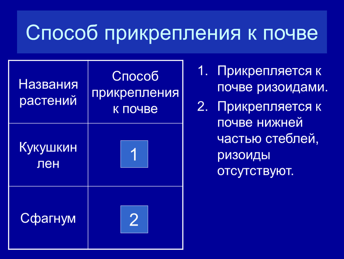 Названия растений | Способ прикрепления к почве |