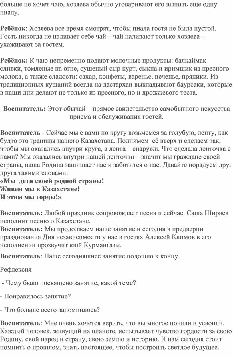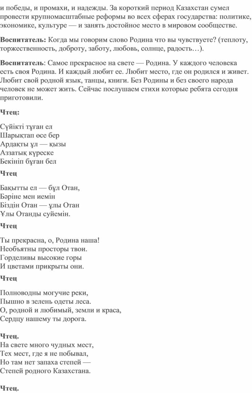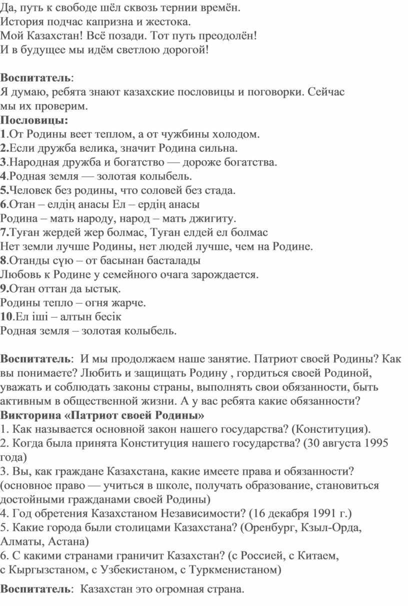 Воспитатель: Сегодня мы будем говорить о нашей стране. Есть в истории даты, которые поневоле заставляют оглянуться назад и не только для того, чтобы вспомнить прошлое, но и для того, чтобы понять будущее. В 1991 году 16 декабря был принят конституционный закон РК «О Государственной Независимости РК». Именно в этот день сбылась мечта всех поколений нашего народа. На древней казахской земле было провозглашено молодое государство. 23 года истории — срок незначительный, но для всех нас это и победы, и промахи, и надежды. За короткий период Казахстан сумел провести крупномасштабные реформы во всех сферах государства: политике, экономике, культуре — и занять достойное место в мировом сообществе.