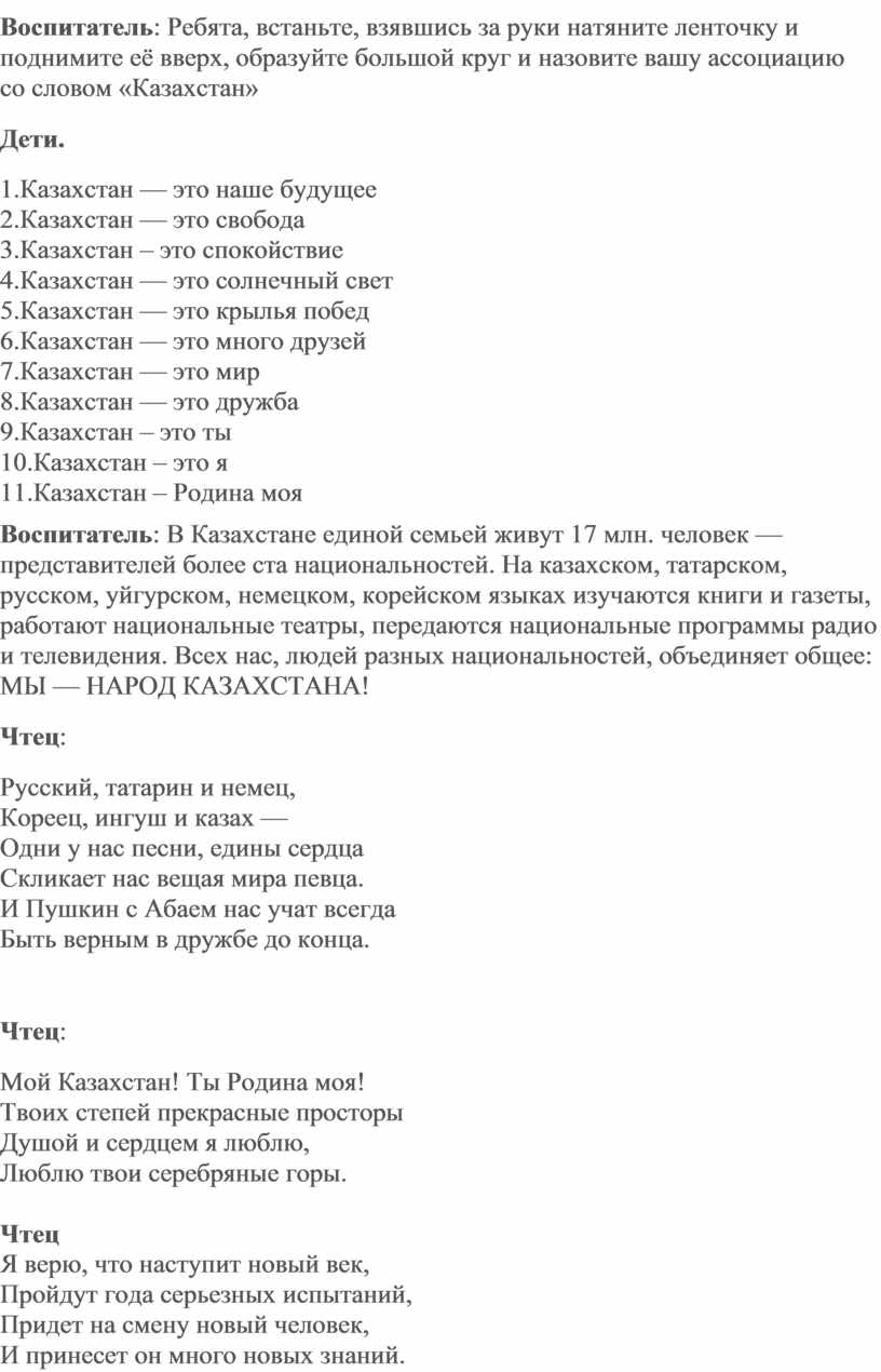 Воспитатель: В Казахстане единой семьей живут 17 млн. человек — представителей более ста национальностей. На казахском, татарском, русском, уйгурском, немецком, корейском языках изучаются книги и газеты, работают национальные театры, передаются национальные программы радио и телевидения. Всех нас, людей разных национальностей, объединяет общее: МЫ — НАРОД КАЗАХСТАНА!