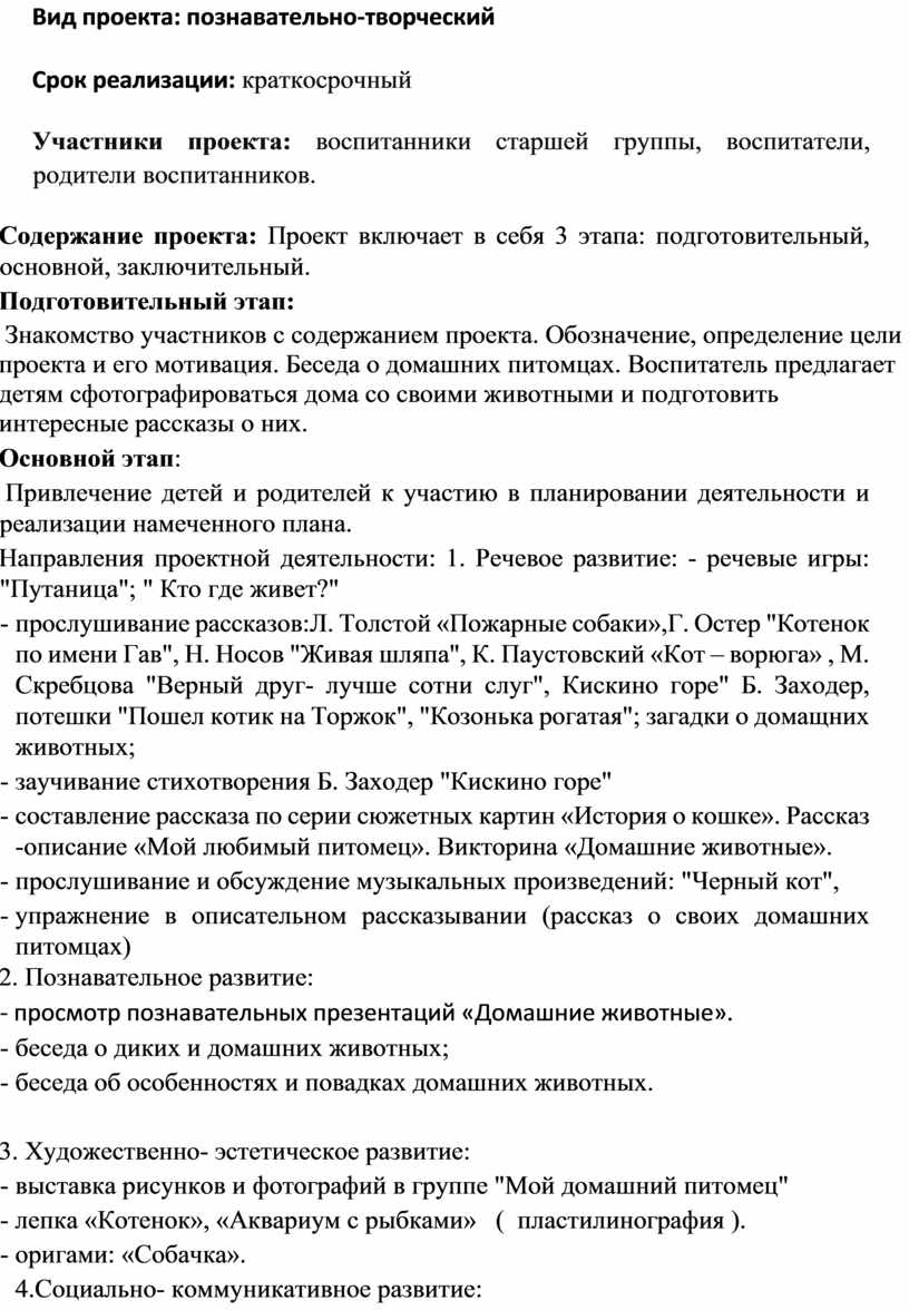 Знакомство участников с содержанием проекта. Обозначение, определение цели проекта и его мотивация. Беседа о домашних питомцах. Воспитатель предлагает детям сфотографироваться дома со своими животными и подготовить интересные рассказы о них.