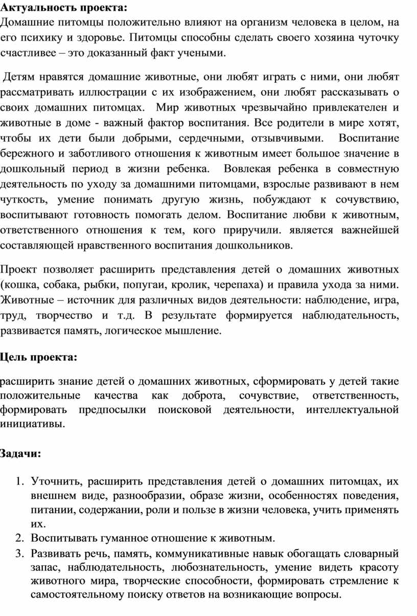 Детям нравятся домашние животные, они любят играть с ними, они любят рассматривать иллюстрации с их изображением, они любят рассказывать о своих домашних питомцах. Мир животных чрезвычайно привлекателен и животные в доме - важный фактор воспитания. Все родители в мире хотят, чтобы их дети были добрыми, сердечными, отзывчивыми. Воспитание бережного и заботливого отношения к животным имеет большое значение в дошкольный период в жизни ребенка. Вовлекая ребенка в совместную деятельность по уходу за домашними питомцами, взрослые развивают в нем чуткость, умение понимать другую жизнь, побуждают к сочувствию, воспитывают готовность помогать делом. Воспитание любви к животным, ответственного отношения к тем, кого приручили. является важнейшей составляющей нравственного воспитания дошкольников.