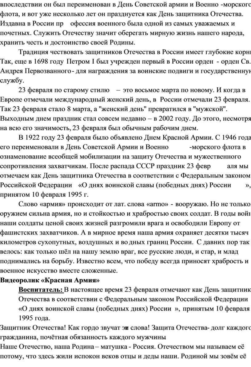Воспитатель: В настоящее время 23 февраля отмечают как День защитника Отечества в соответствии с Федеральным законом Российской Федерации «О днях воинской славы (победных днях) России», принятым 10 февраля 1995 года.