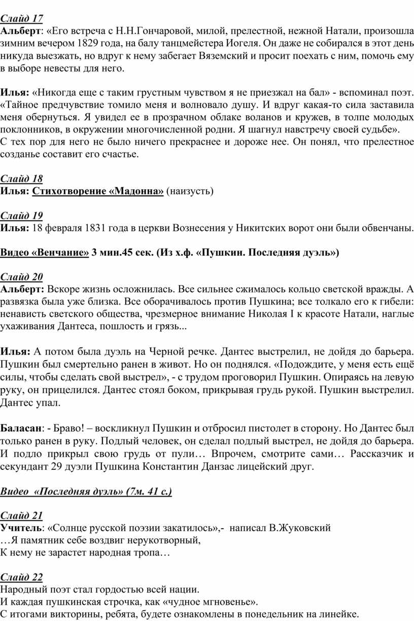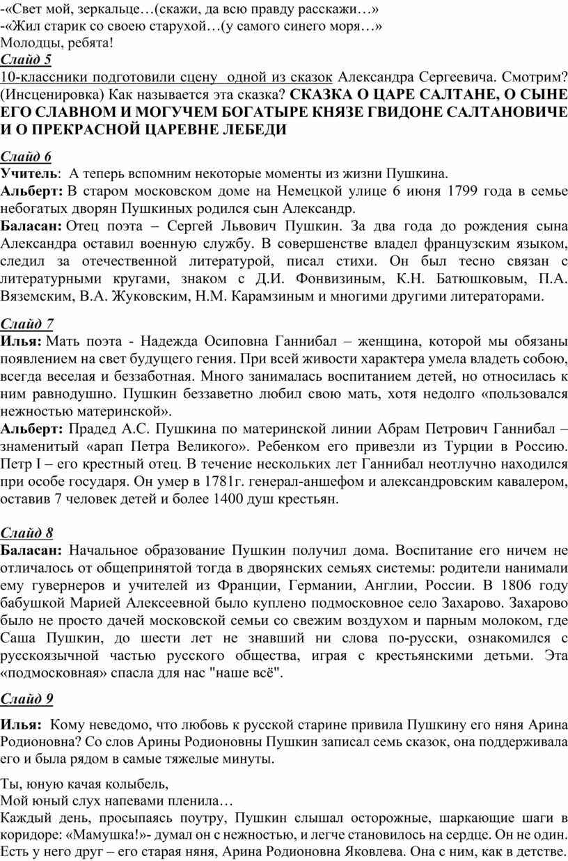 Учитель: А теперь вспомним некоторые моменты из жизни Пушкина.