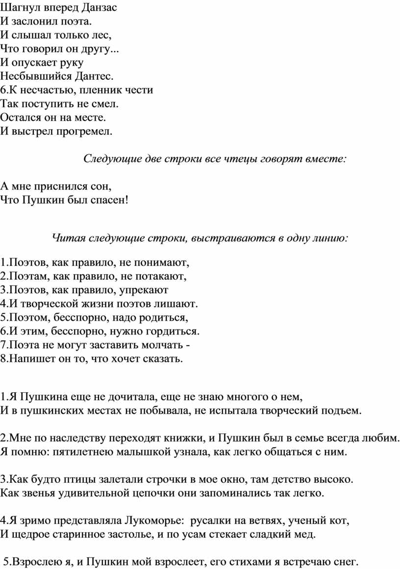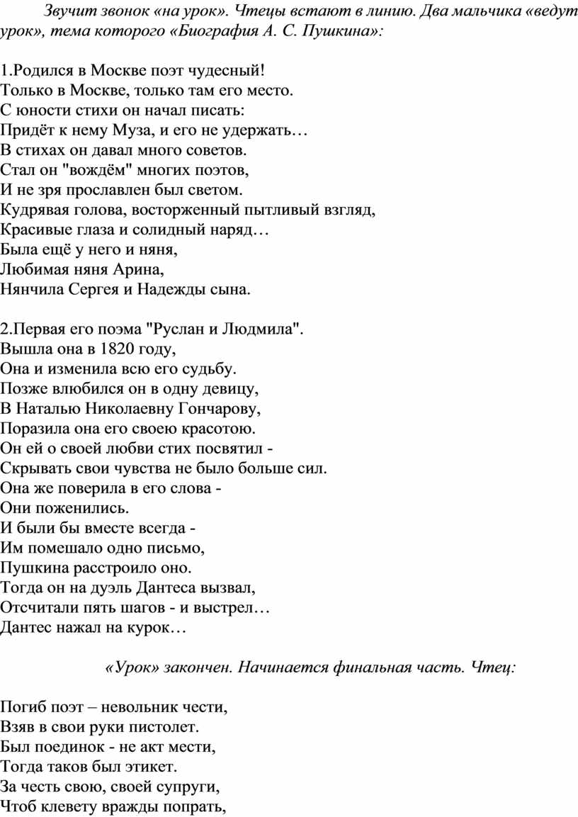 Звучит звонок «на урок». Чтецы встают в линию. Два мальчика «ведут урок», тема которого «Биография А. С. Пушкина»: