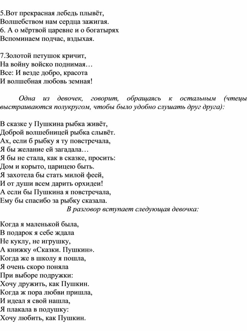На сцену, прижимая к груди томик со сказками А. С. Пушкина, выходит девочка, обращается к зрителям: