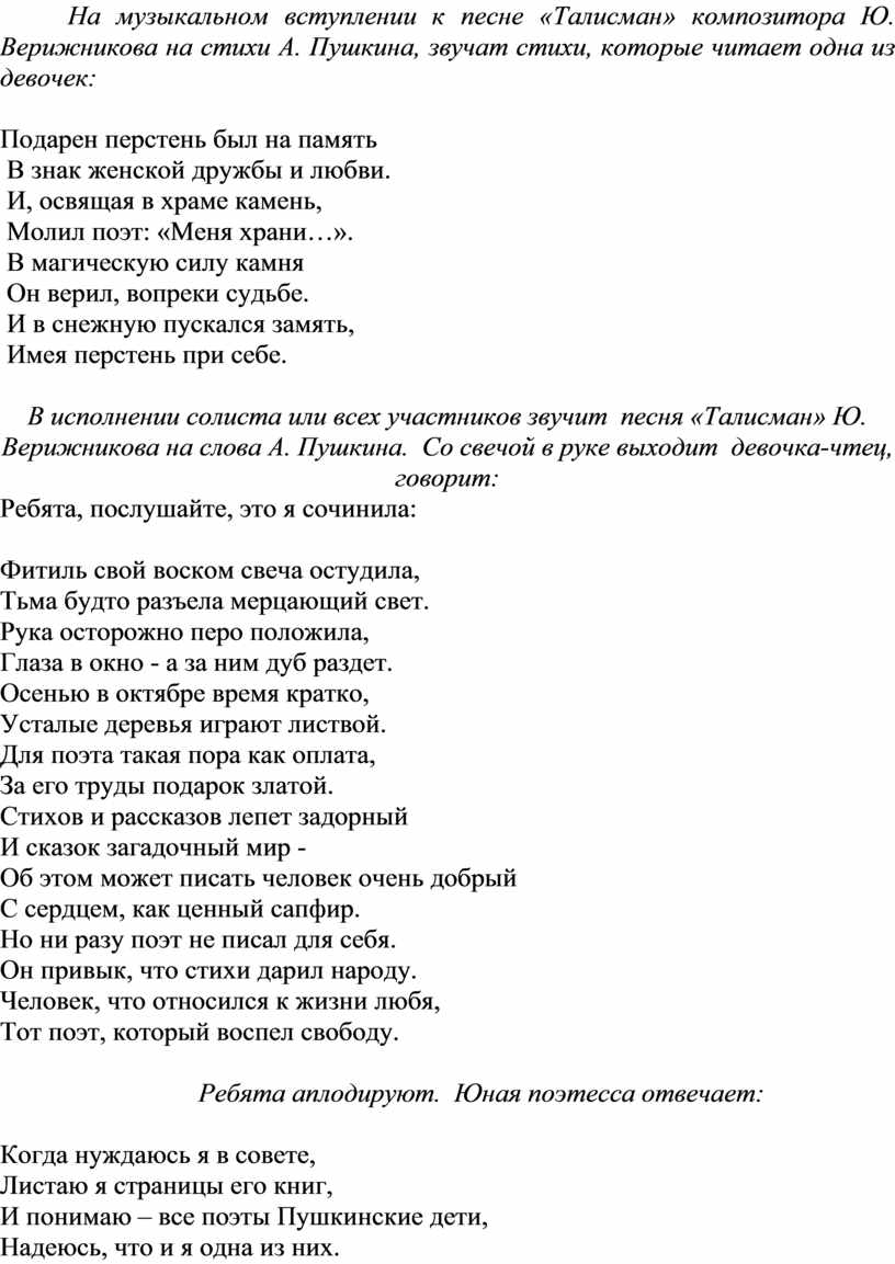 В исполнении солиста или всех участников звучит песня «Талисман» Ю. Верижникова на слова А. Пушкина. Со свечой в руке выходит девочка-чтец, говорит: