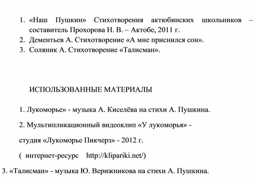 1. «Наш Пушкин» Стихотворения актюбинских школьников – составитель Прохорова Н. В. – Актобе, 2011 г.