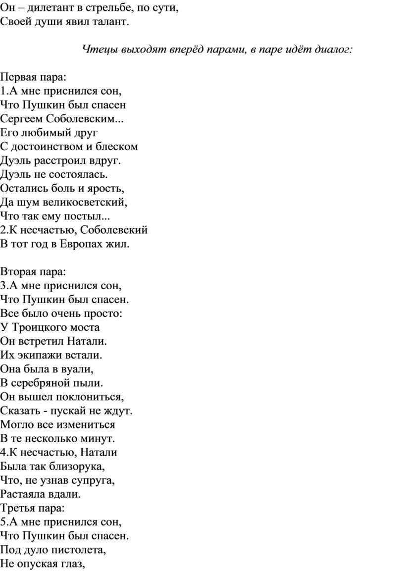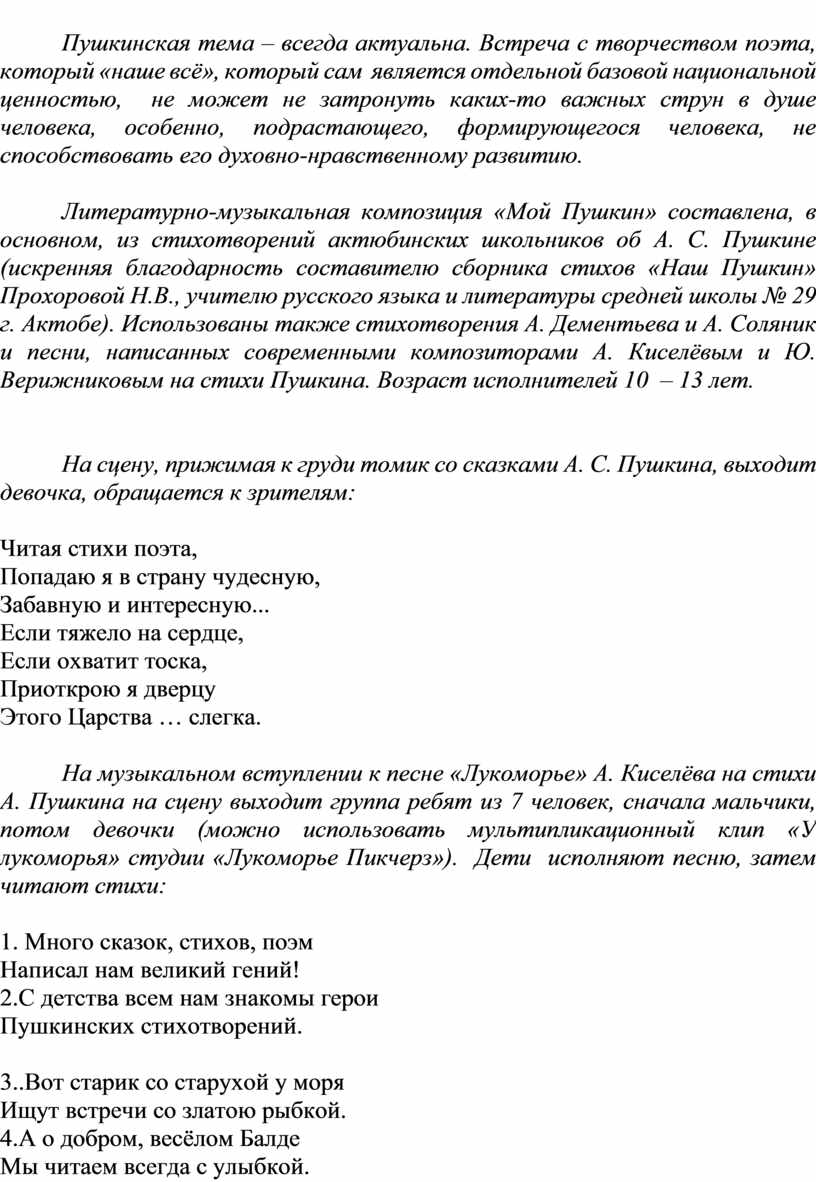 Литературно-музыкальная композиция «Мой Пушкин» составлена, в основном, из стихотворений актюбинских школьников об А. С. Пушкине (искренняя благодарность составителю сборника стихов «Наш Пушкин» Прохоровой Н.В., учителю русского языка и литературы средней школы № 29 г. Актобе). Использованы также стихотворения А. Дементьева и А. Соляник и песни, написанных современными композиторами А. Киселёвым и Ю. Верижниковым на стихи Пушкина. Возраст исполнителей 10 – 13 лет.
