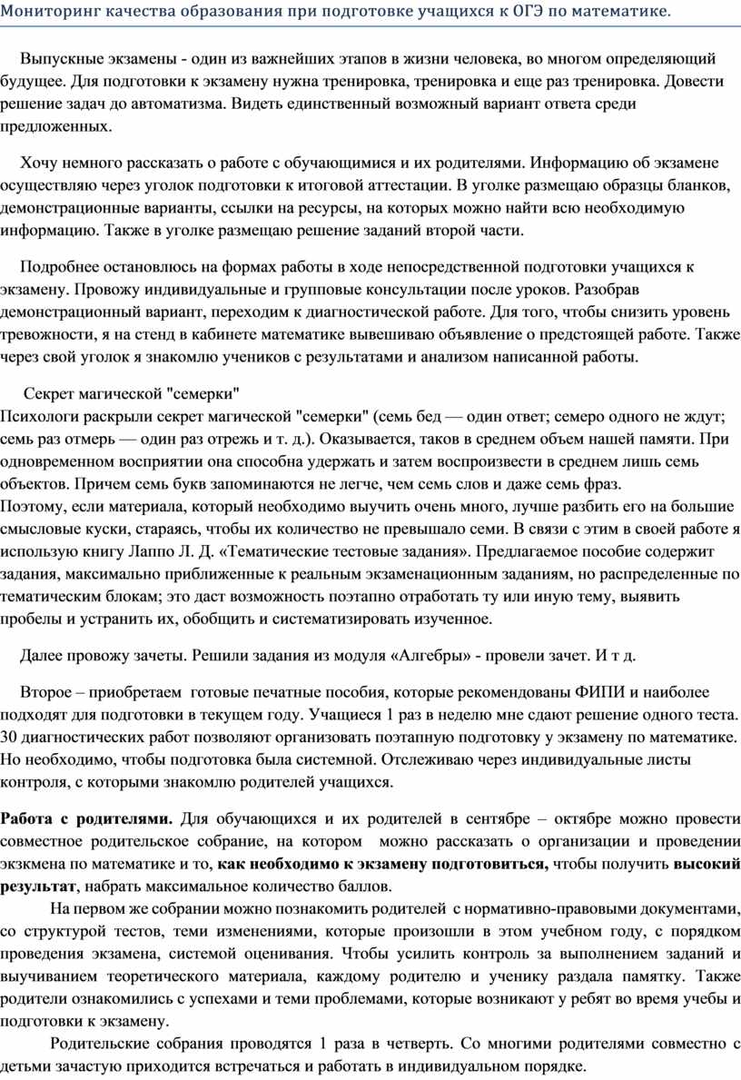 Работа с родителями. Для обучающихся и их родителей в сентябре – октябре можно провести совместное родительское собрание, на котором можно рассказать о организации и проведении экзкмена по математике и то, как необходимо к экзамену подготовиться, чтобы получить высокий результат, набрать максимальное количество баллов.