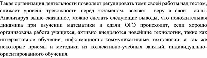 Такая организация деятельности позволяет регулировать темп своей работы над тестом, снижает уровень тревожности перед экзаменом, вселяет веру в свои силы. Анализируя выше сказанное, можно сделать следующие выводы, что положительная динамика при изучении математики и сдачи ОГЭ происходит, если хорошо организована работа учащихся, активно внедряются новейшие технологии, такие как интерактивное обучение, информационно-коммуникативные технологии, а так же некоторые приемы и методики из коллективно-учебных занятий, индивидуально-ориентированного обучения.